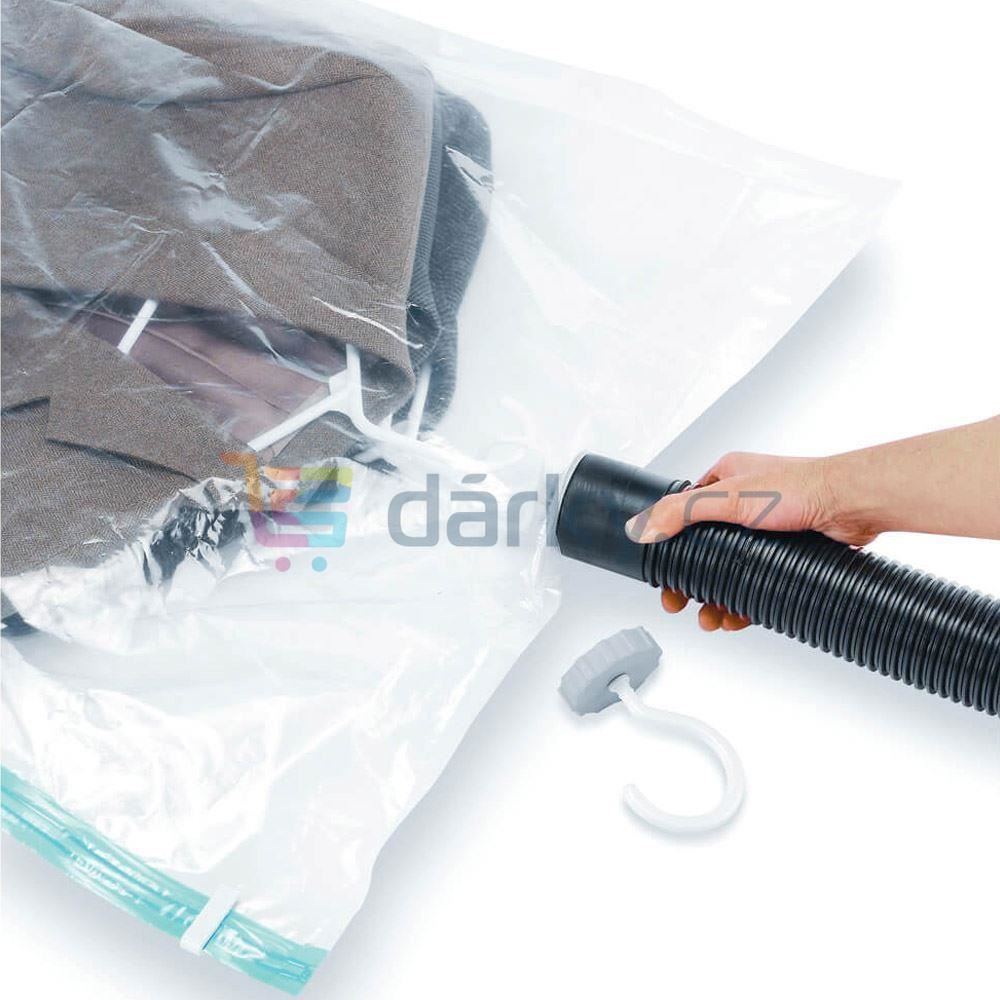 S vakuovým pytlem lze ušetřit spoustu místa. Je vhodný na zimní oblečení, svetry, bundy, ale například i na zrovna nevyužívané lůžkoviny. Pytel představuje okamžité řešení pro všechny, kdo mají ve skříni chaos a rádi by uspořádali sezonní oblečení. Výhodou pytle je očko podobné jako na šatním ramínku, díky kterému jej můžete umístit na závěsnou tyč do skříně.